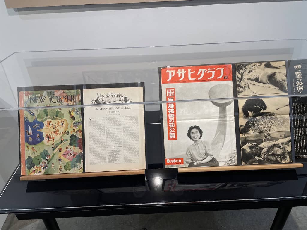 Display case showing 1947 New Yorker magazine that was completely given over to the original John Hersey report on Hiroshima, and Japanese magazine with similarly innocuous cover that contains the first published photos of Hiroshima survivors, 1952. (Photo credit: Libbe HaLevy)