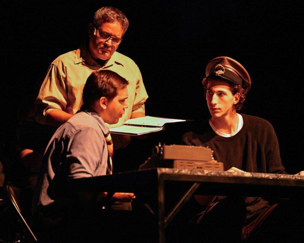 (r-l) Otto Cipollini as Gen. Leslie Groves, Kevin Wall as William L. Laurence (“Atomic Bill”) and behind him, Gary Sheldon as NYTimes editor Edwin James – the moment when Groves co-opts Bill into the Manhattan Project. (Photo credit: Randall Sarvis, Wilmington College)