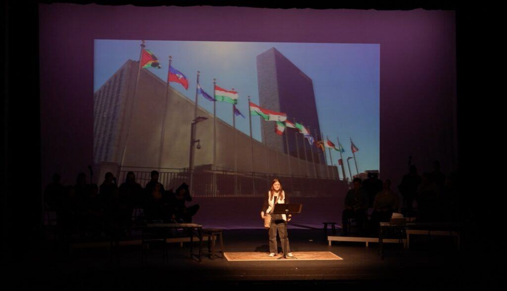 Ollie Basta, playing the lead role of podcaster/activist Jessie Keever, addresses a rally at the United Nations at the climax of ATOMIC BILL AND THE PAYMENT DUE