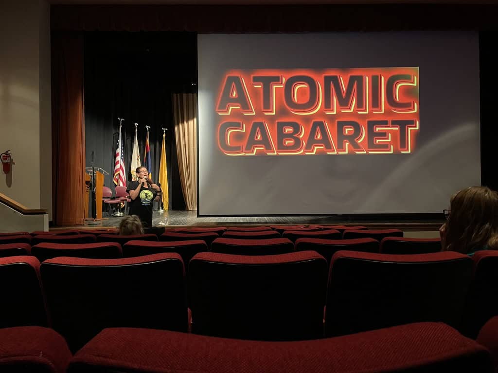 Lynda Williams, “The Physics Chanteusse,” straight from the Edinburgh Fringe Festival, knocked our socks off performing excerpts from her show ATOMIC CABARET. Then she rocked the house with the world premiere of her new song – finished just that afternoon! – HAUL NO!, in honor of Leona Morgan and Haul No’s fight against uranium transport via truck through Navajo lands.