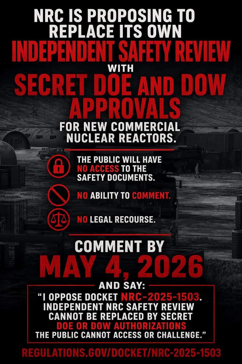 “I oppose Docket NRC-2025-1503. Independent NRC safety review cannot be replaced by secret DOE or DOW authorizations the public cannot access or challenge.” - Comment by May 4: