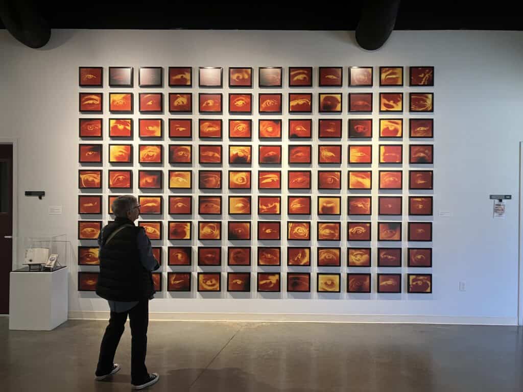 Photo wall installation of 108 close-ups of the eyes of Hibakusha and Downwinders who witnessed the atomic bombings of Trinity, Hiroshima and Nagasaki. (Photo Credit: Tanya Maus)