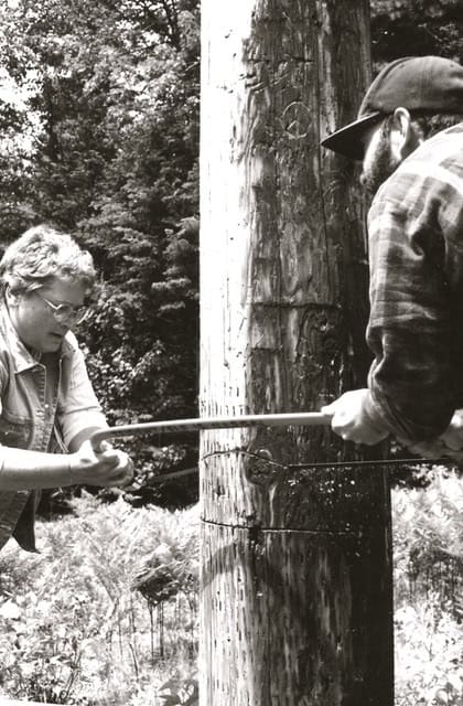 Nukewatch founder Bonnie Urfer and Mike Sprong, as part of the Silence Trident Plowshares action, cutting an ELF pole, June 24, 2000. Note the peace sign carved into the pole.